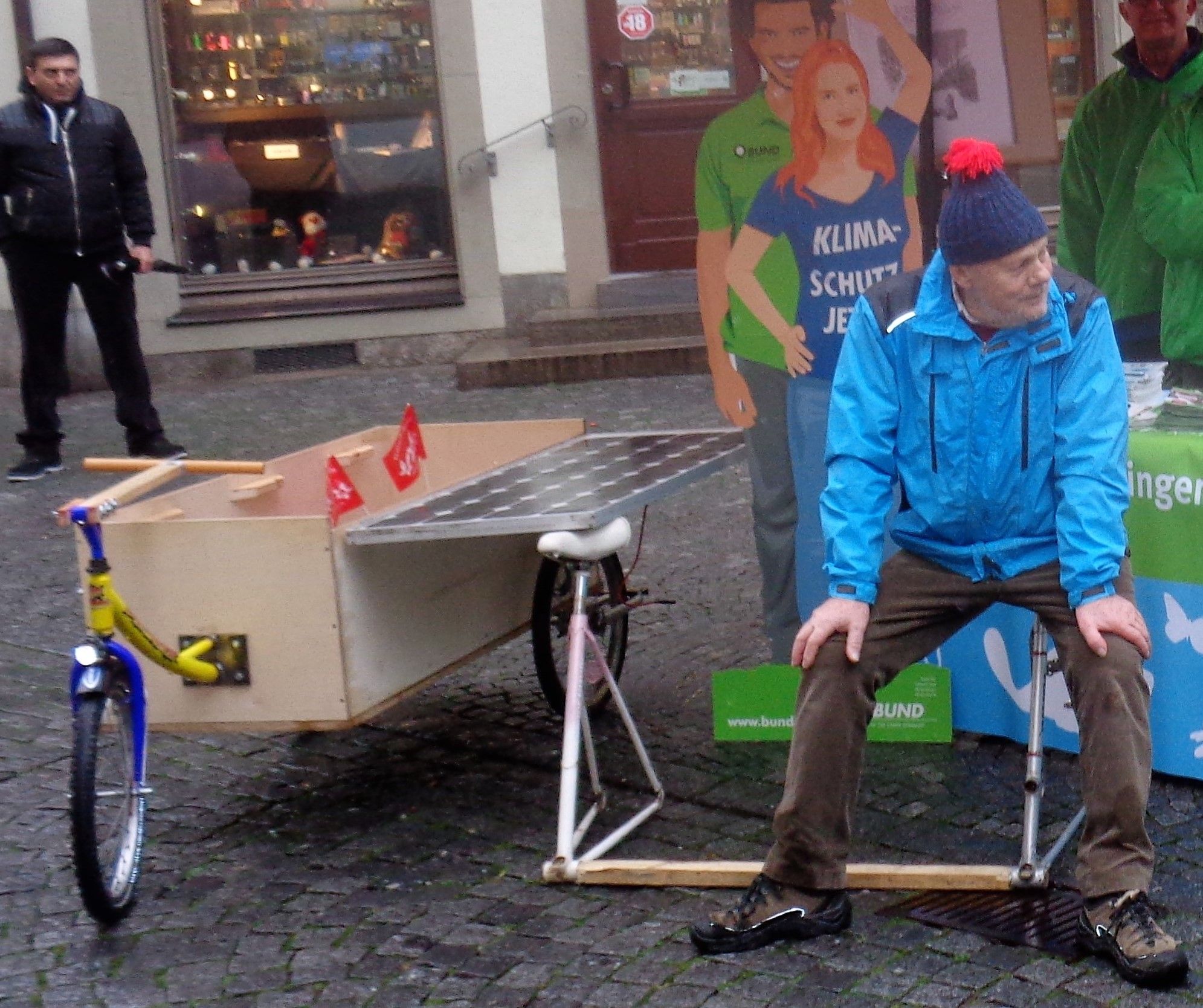 Im Vordergrund des Bildes sitzt Christoph Baare, der neu gewählte Vorsitzende der Ortsgruppe Kitzingen des Bund Naturschutz, auf zu stationären Sitzgelegenheiten umfunktionierten Fahrradteilen. Diese Idee entstand in der auch von ihm wesentlich unterstützten Fahrradwerkstatt im Corlette Circle, in der etliche Asylbeweber sich in der Restaurierung dort abgegebener oft reparaturbedürftiger Fahrräder nützlich machen. Der dort gebaute Bollerwagen in der linken Bildhälfte bezieht aus einem Photovoltaik-Element Strom für eine Lithium Batterie. Dieser Strom treibt eine Pumpe an, mit der man im Sommer einen Teil der Bewässerungsprobleme im NIK-Gelände zu lösen gedenkt.