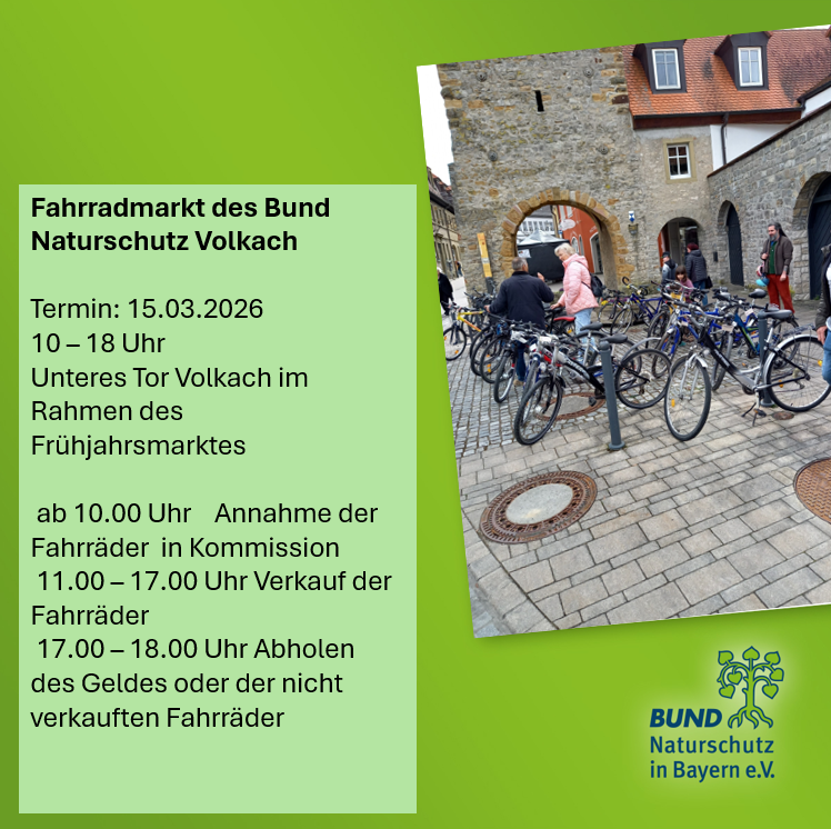 Wie immer am Frühjahrsmarkt startet der Bund Naturschutz seinen Fahrradmarkt. Gebrauchte Fahrräder können hier abgegeben werden und ebenso gekauft werden. Dies lohnt sich vor allem bei Kinderfahrrädern, die schnell wieder “ausgewachsen” sind!